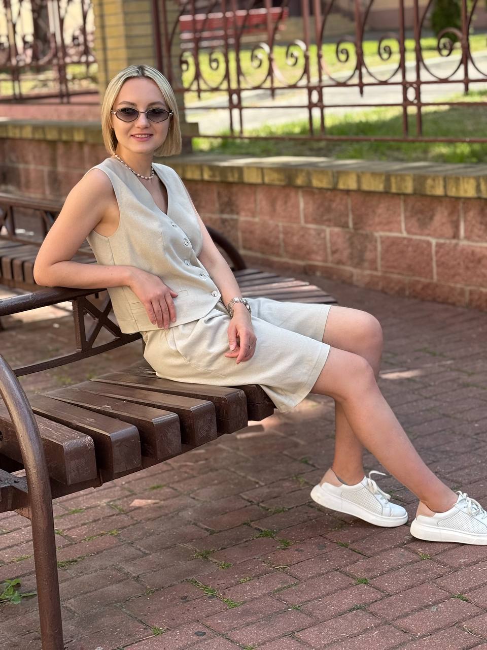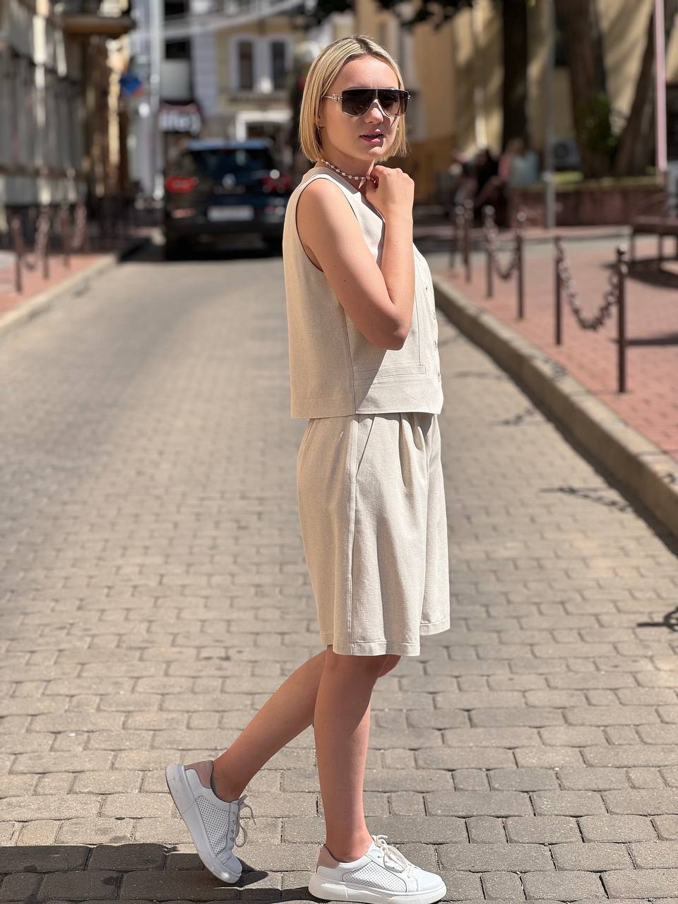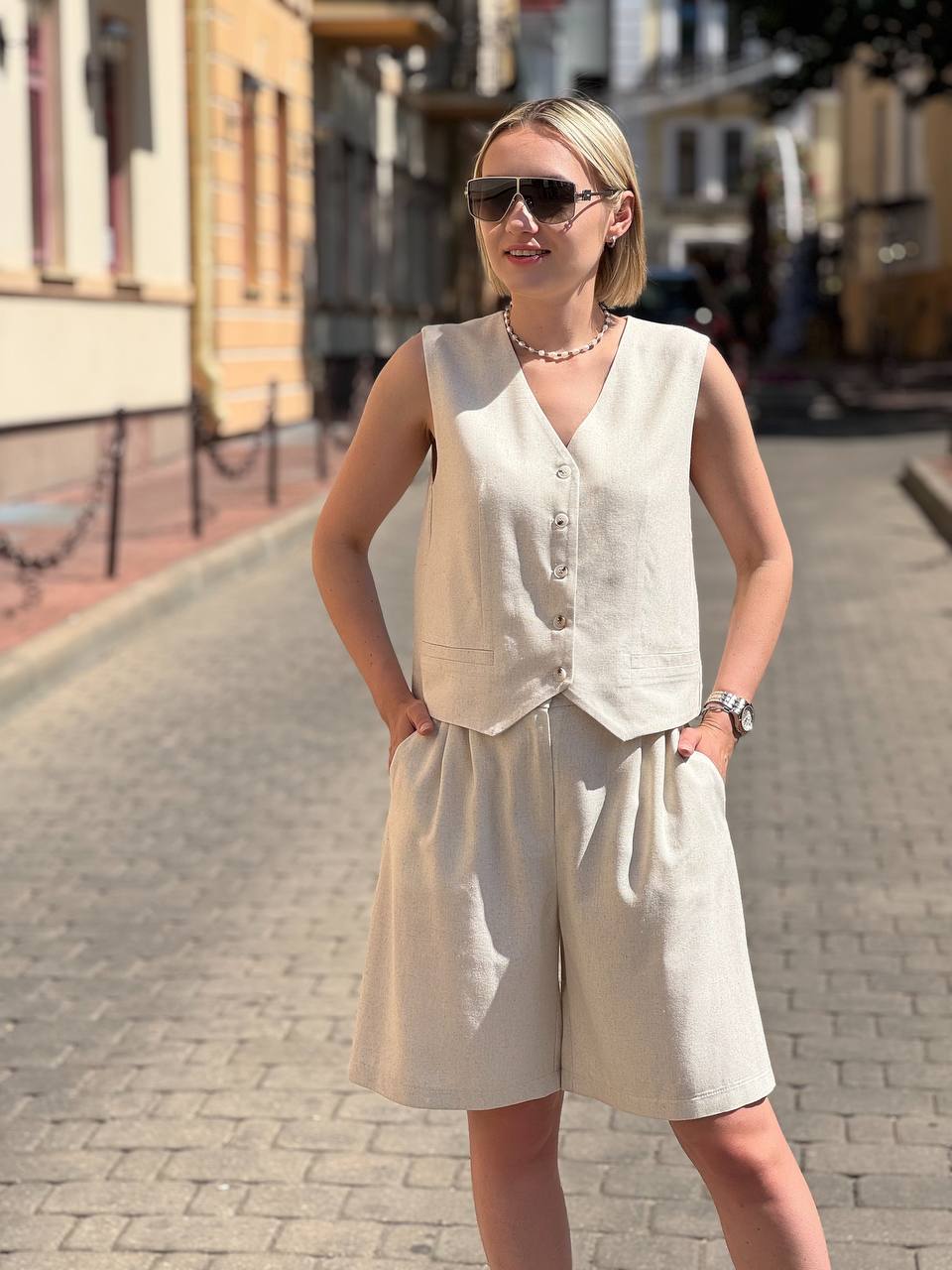 Стильный льняной костюм, состоящий из жилета и удлиненных шорт.