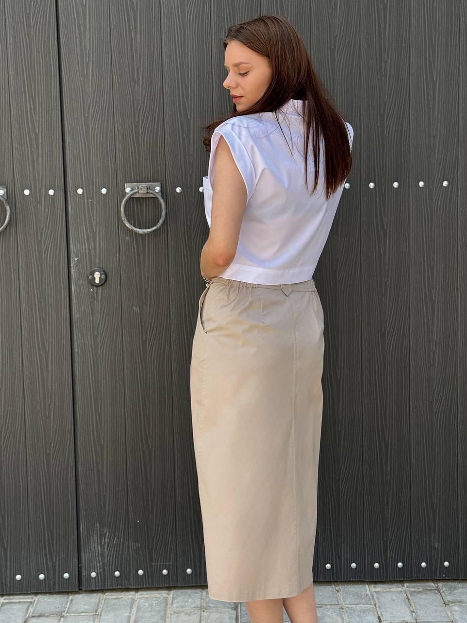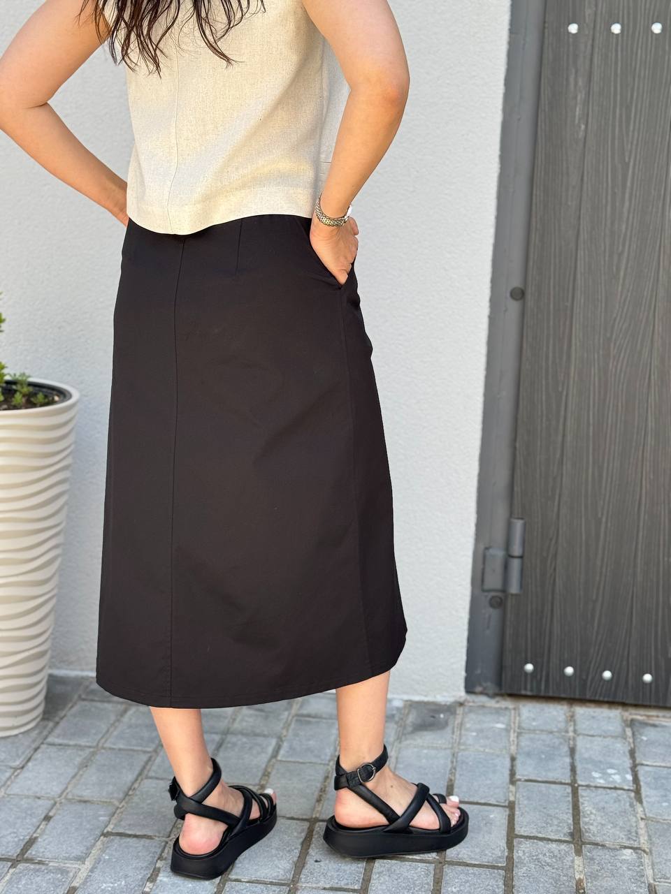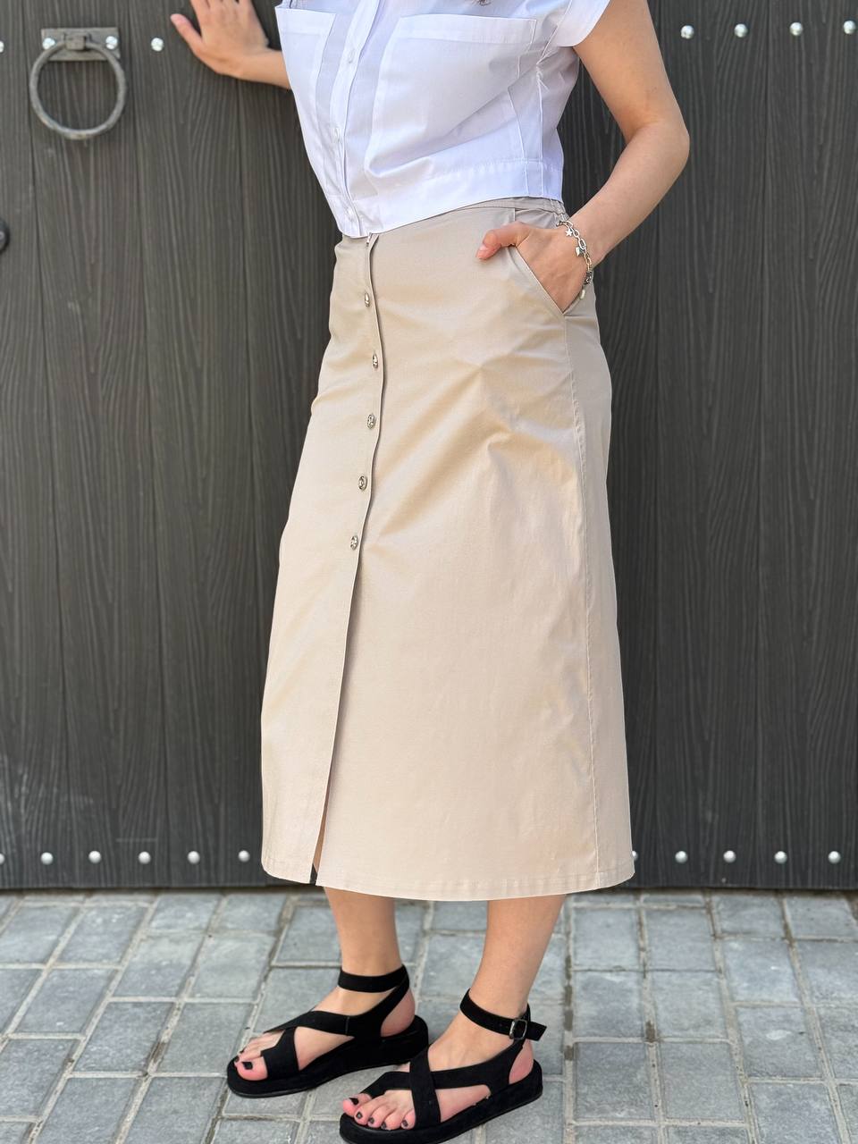 Стильная юбка в длине миди из премиального хлопка с акцентными пуговицами спереди.