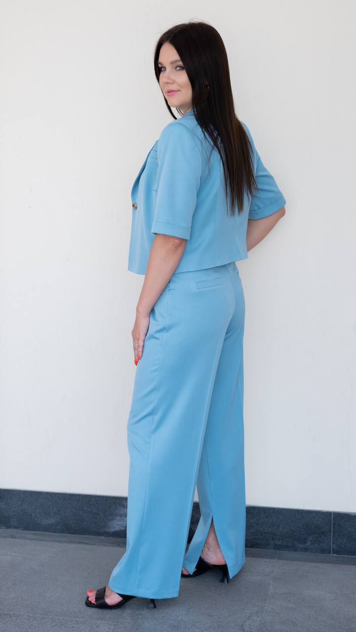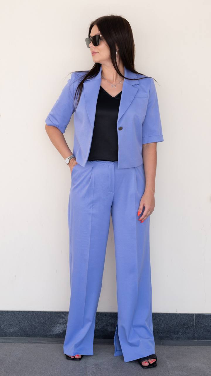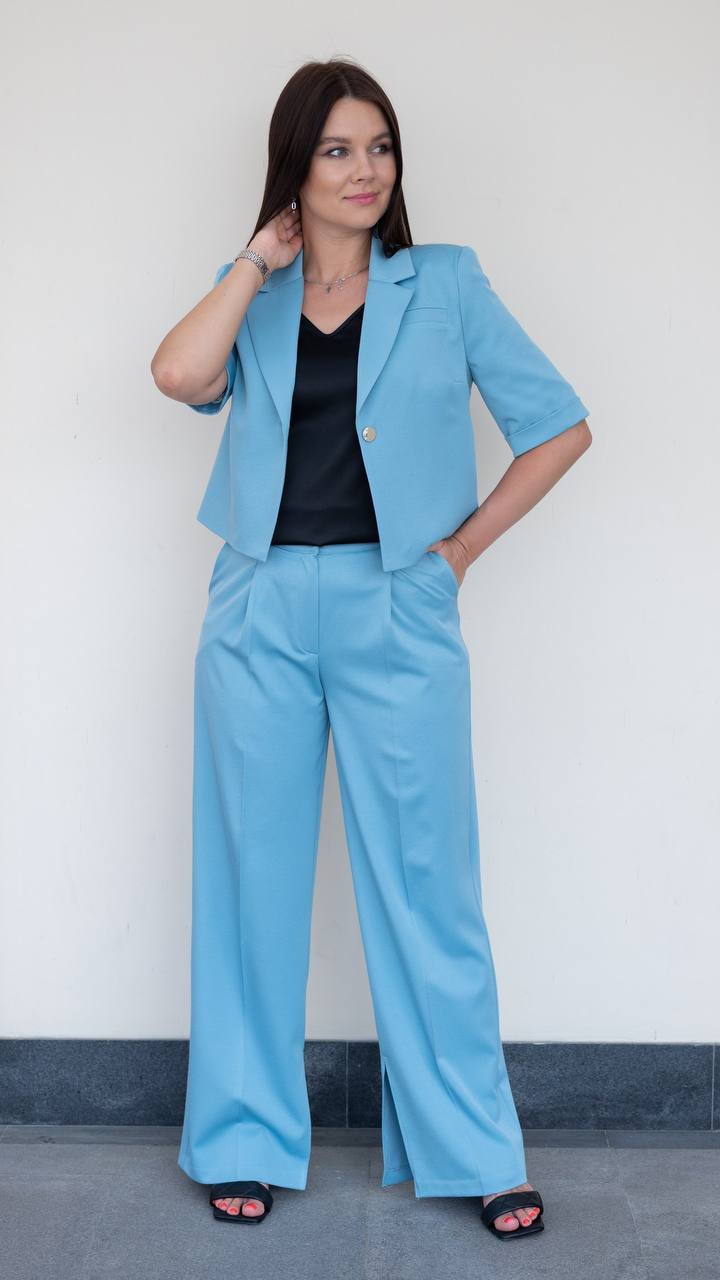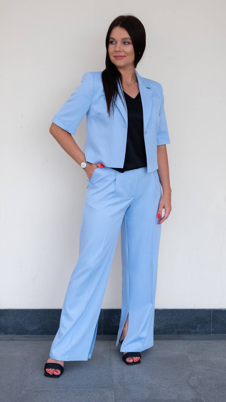 Элегантный брючный костюм, состоящий из укороченного жакета и брюк свободного силуэта с разрезами.