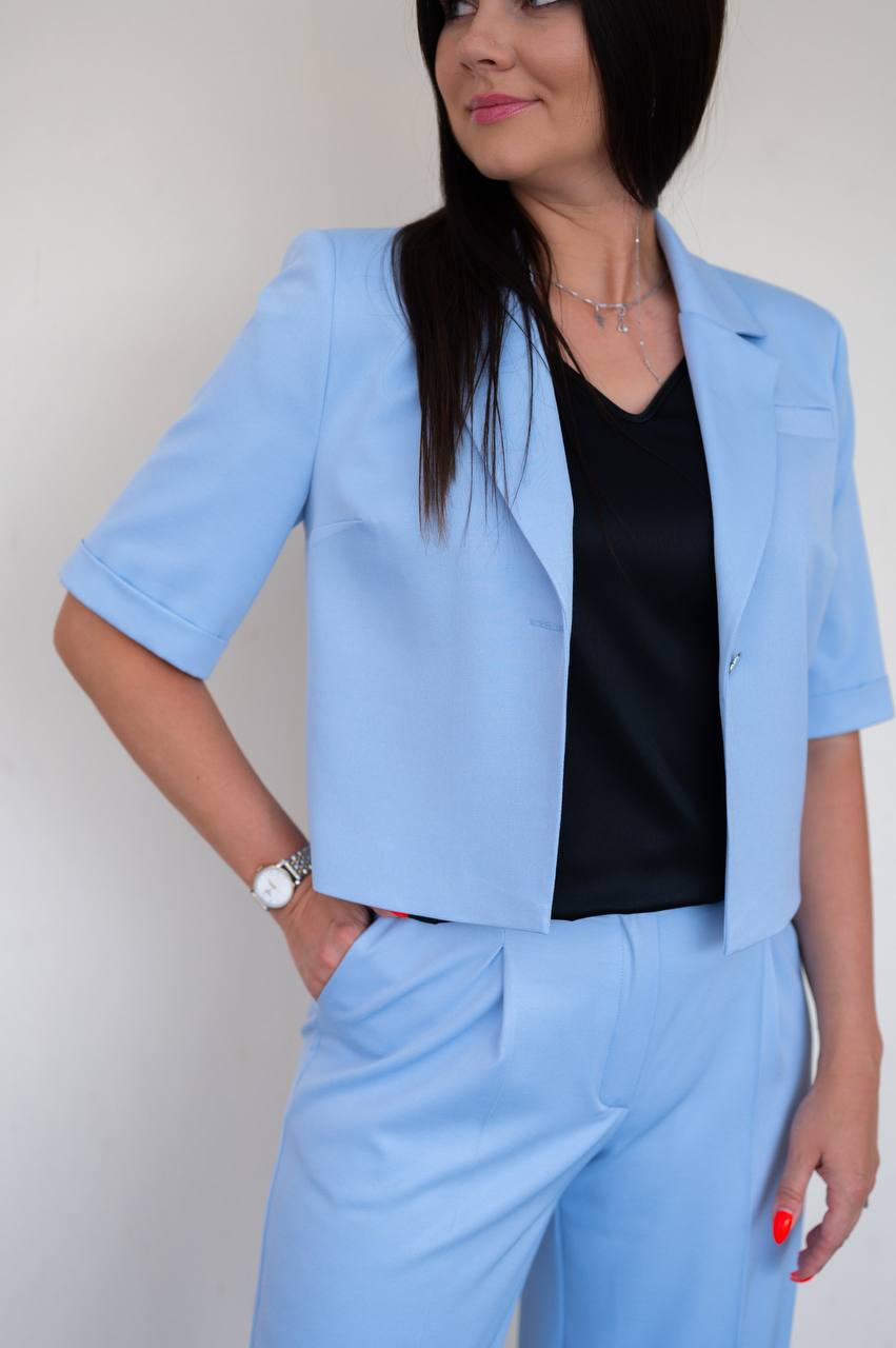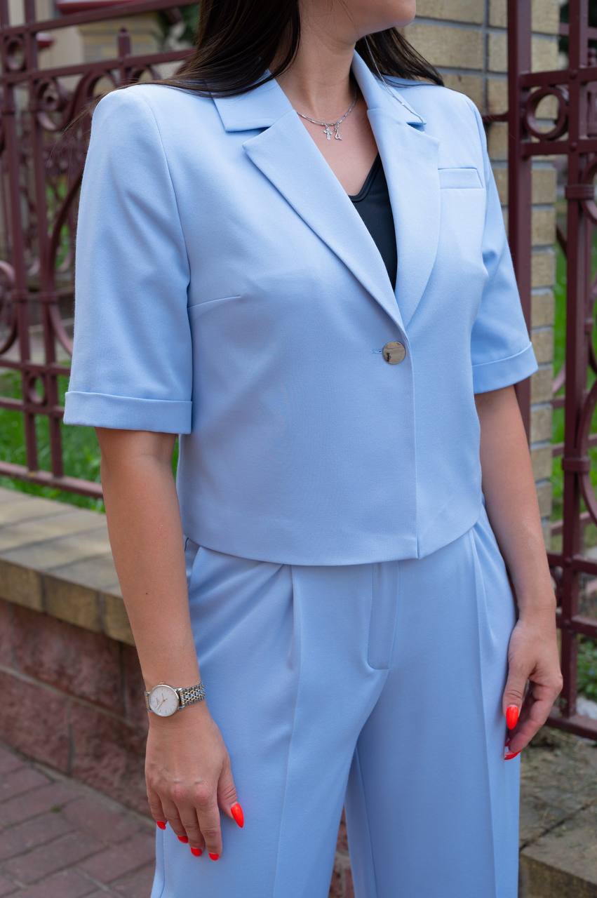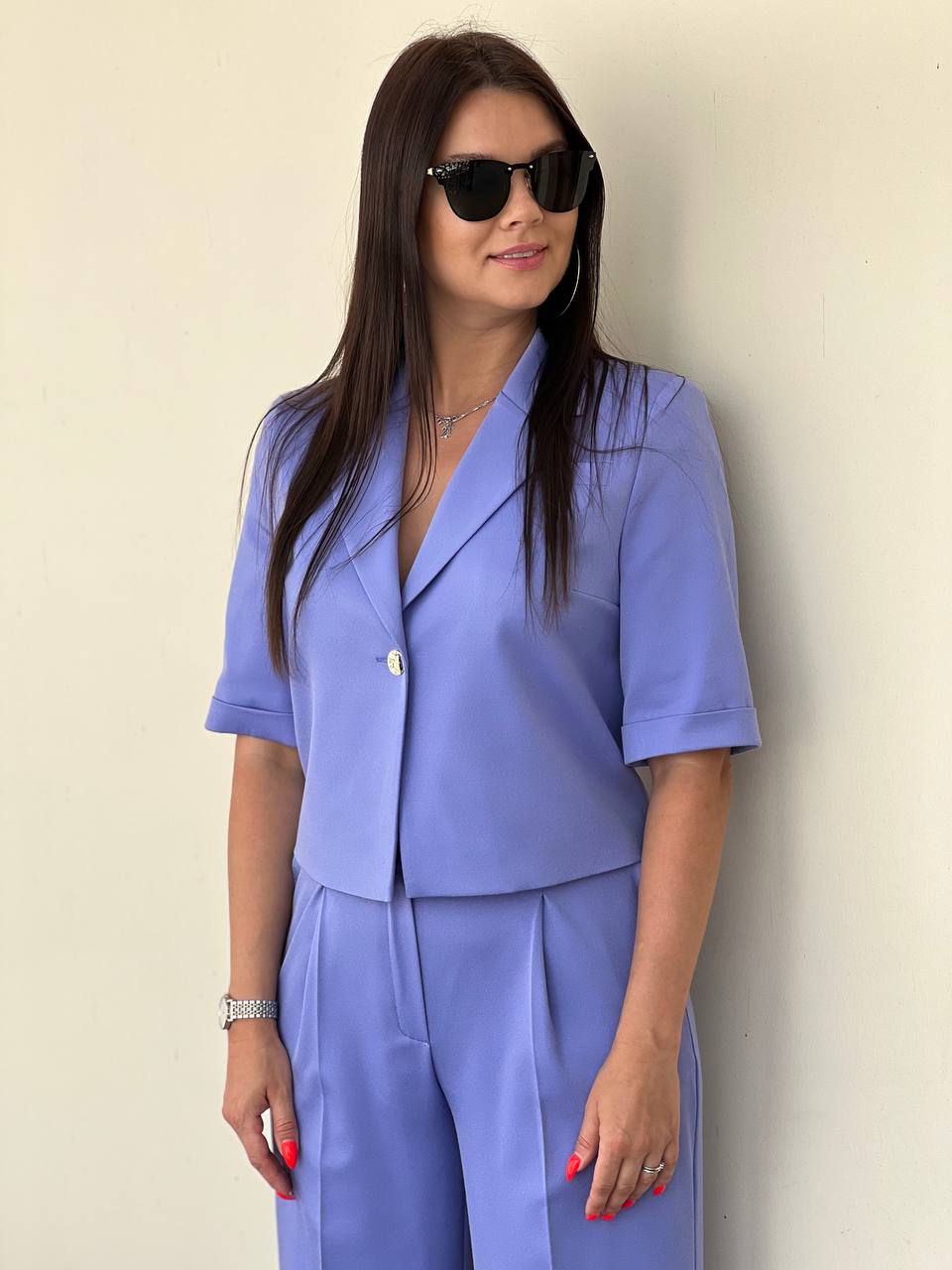 Элегантный брючный костюм, состоящий из укороченного жакета и брюк свободного силуэта с разрезами.