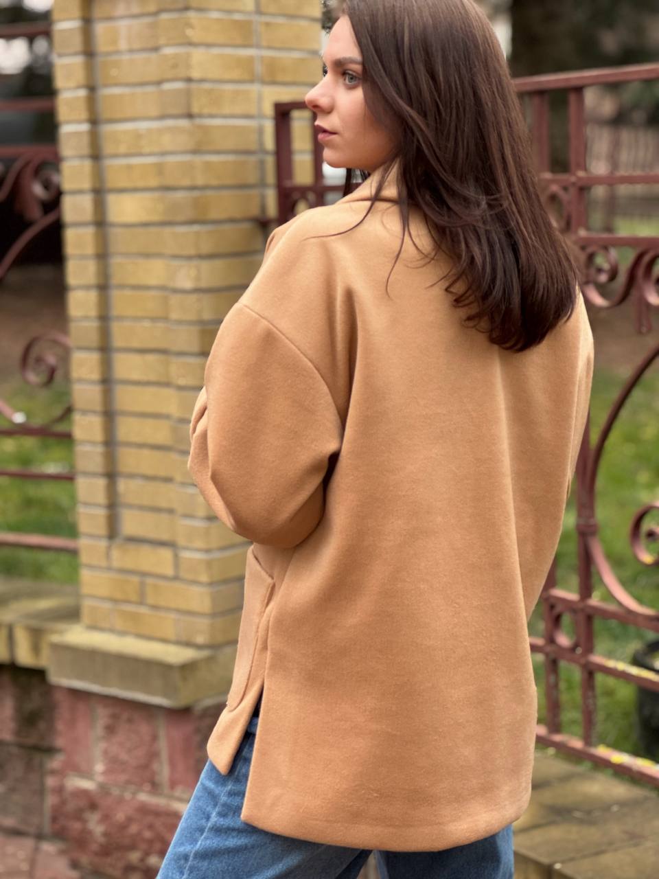 Двубортное полупальто свободного силуэта со спущенными плечами и поясом.