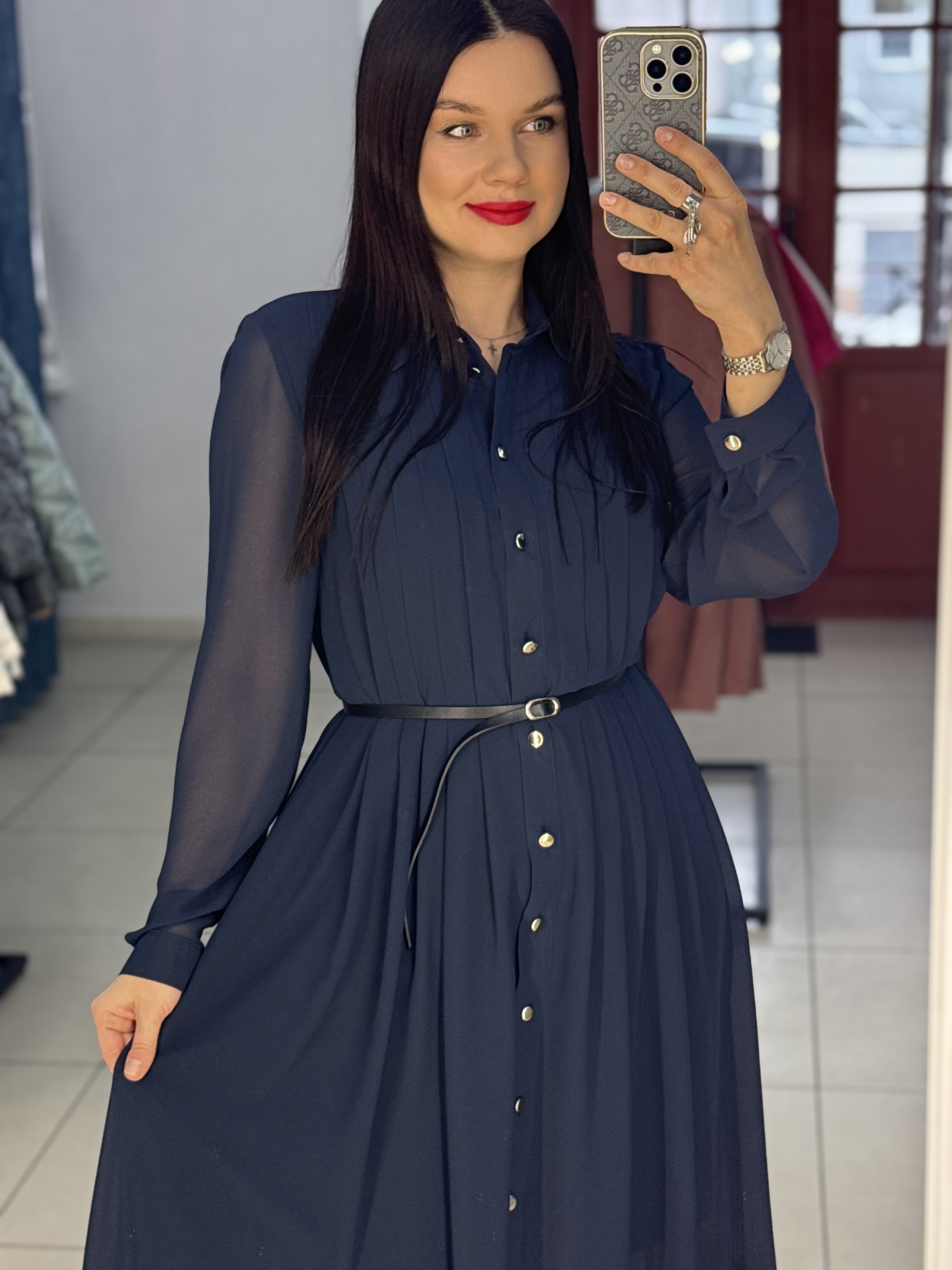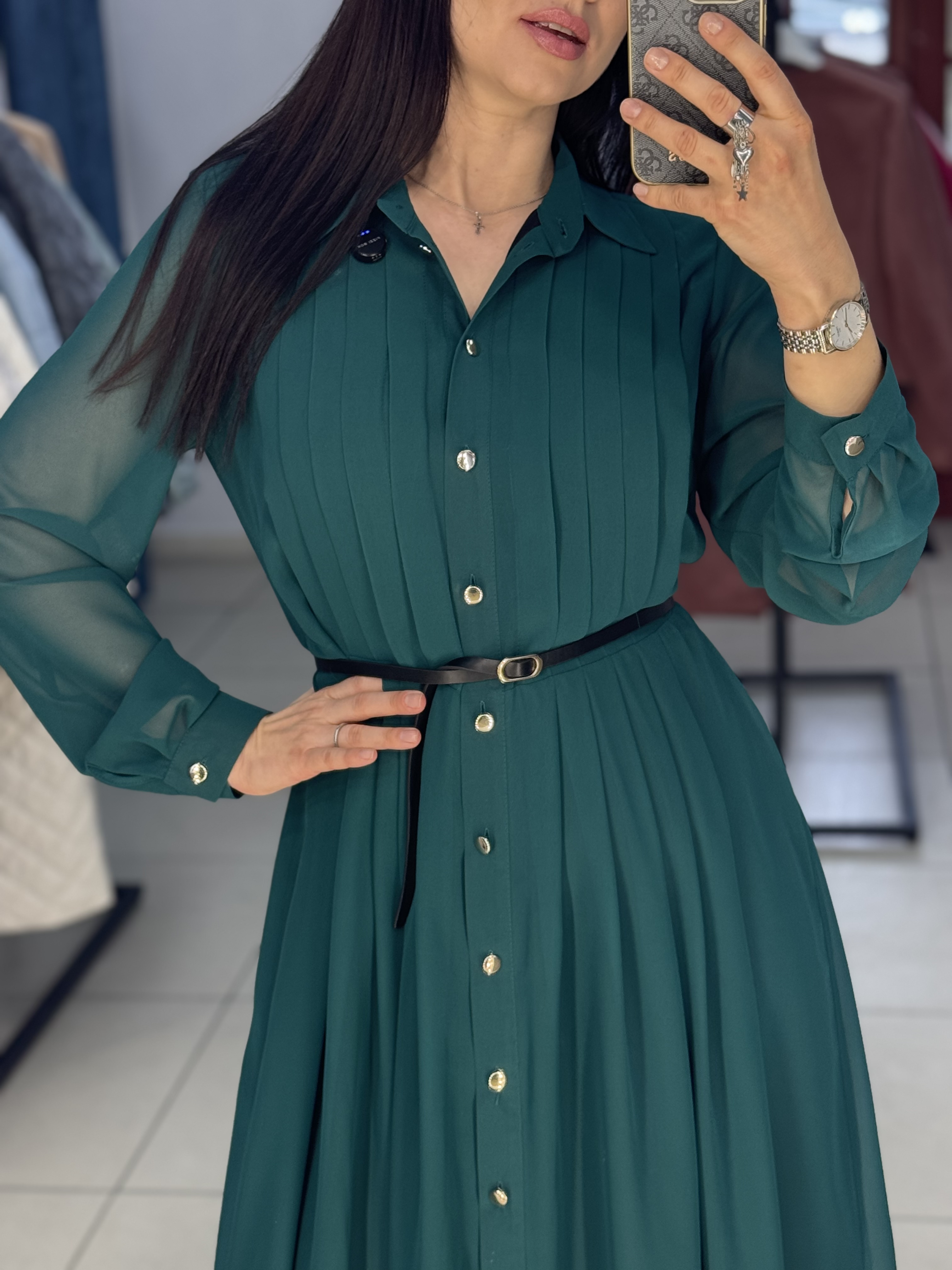 Шифоновое платье свободного силуэта с элегантными деталями на груди и с акцентным ремнем на талии. Длина по спинке-121 см.