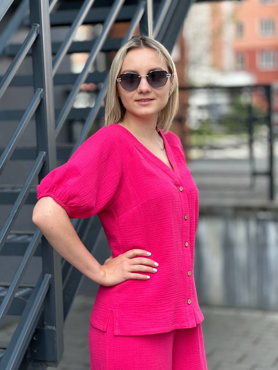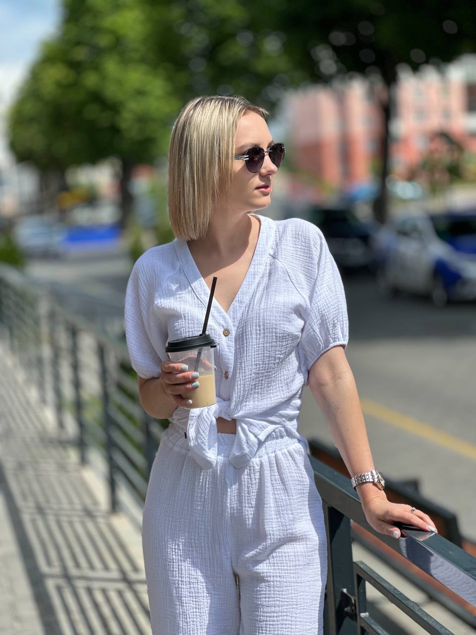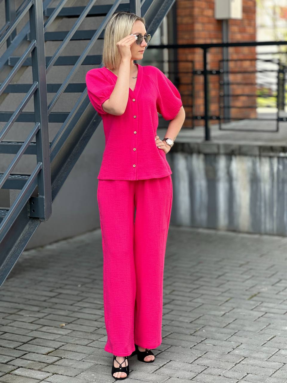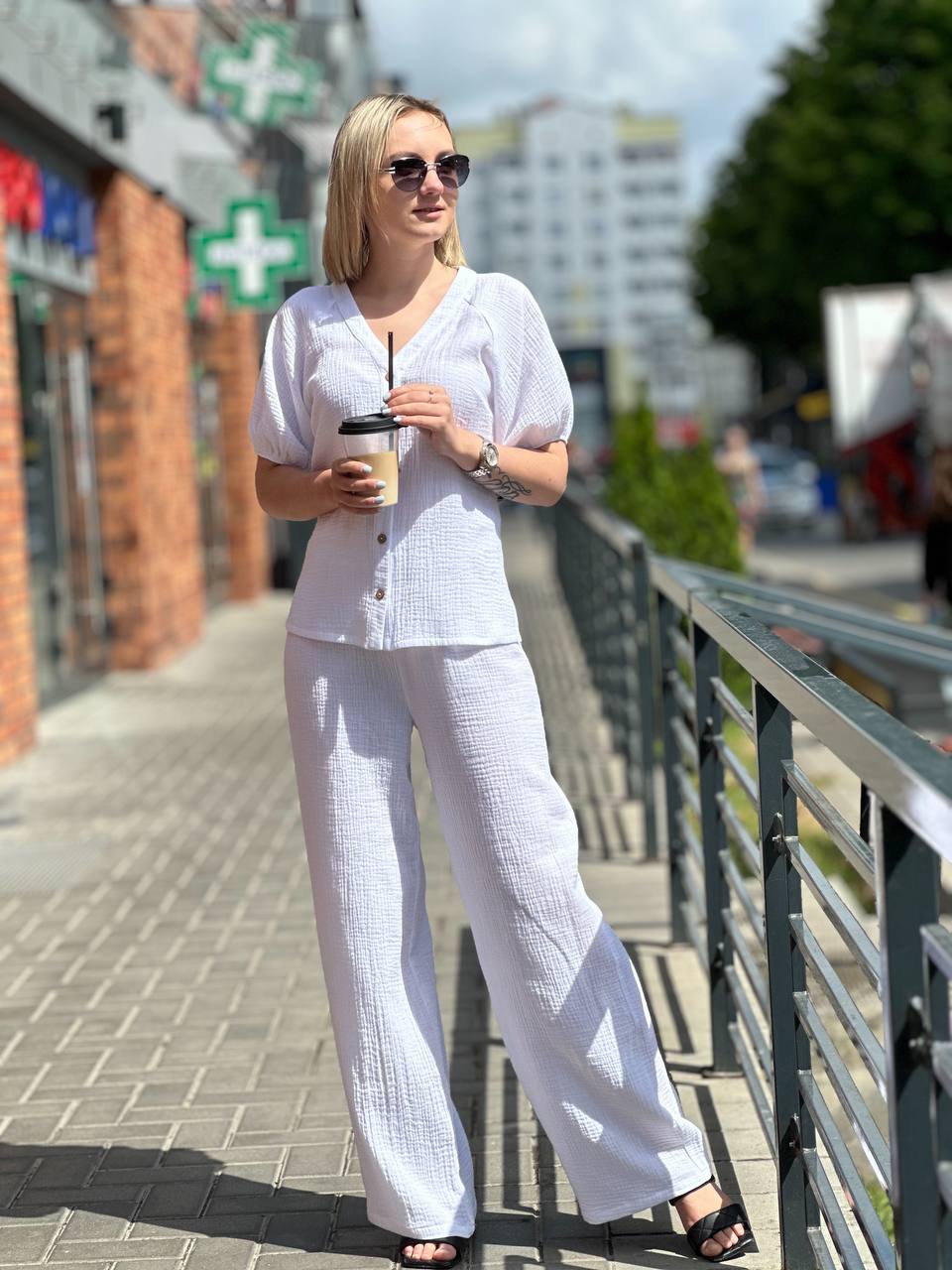 Легкий брючный костюм из муслина, который состоит из невесомой женственной блузы и широких брюк из нежнейшего хлопка.
