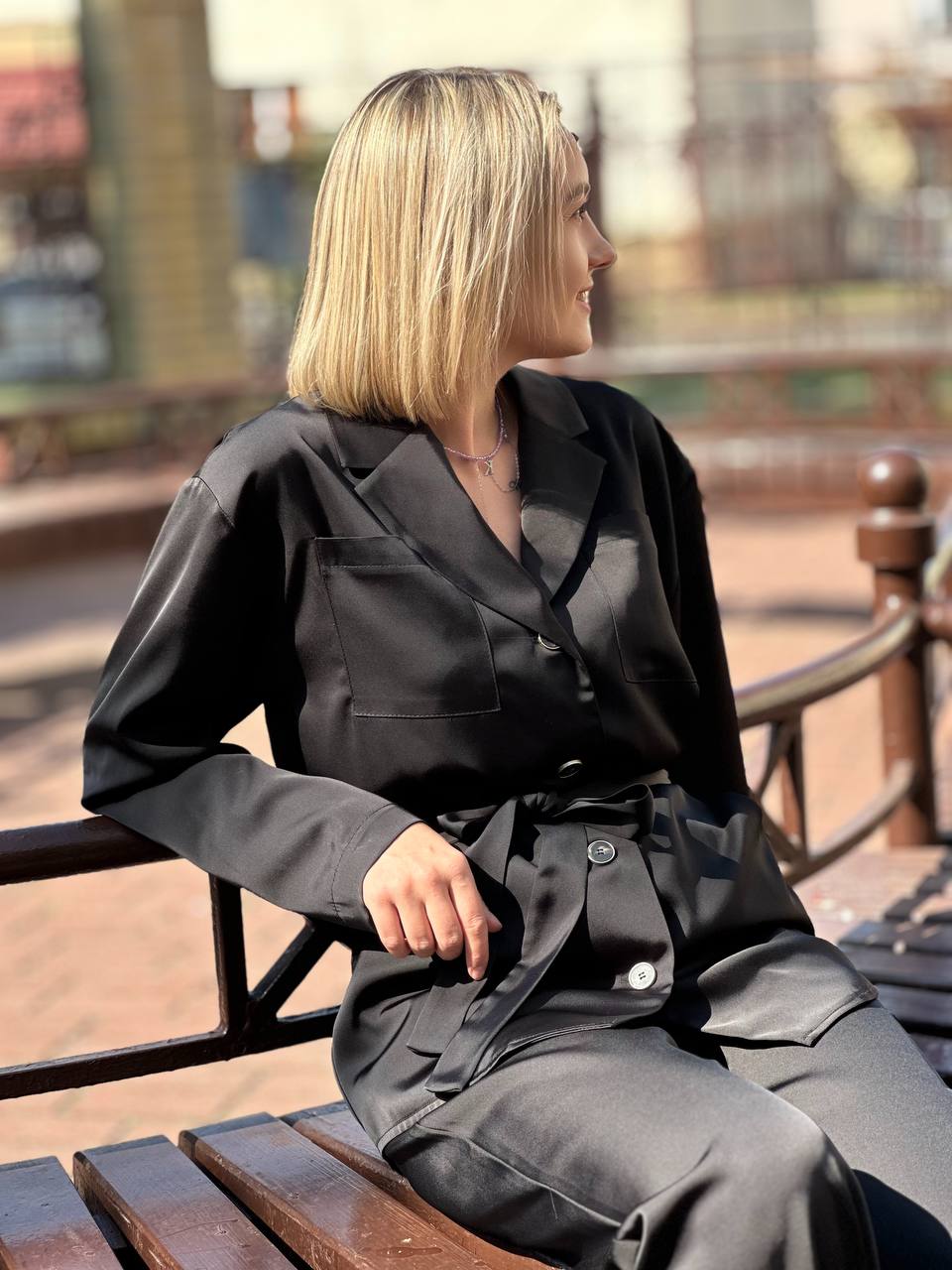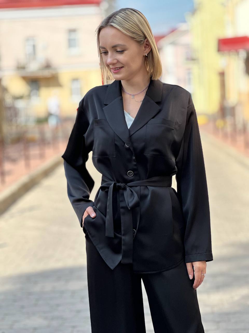 Эффектный костюм пижамного кроя из премиальной шелковой ткани. Он состоит из брюк свободного силуэта с резинкой на талии и жакета рубашечного кроя со спущенными плечами. Пояс в комплекте.