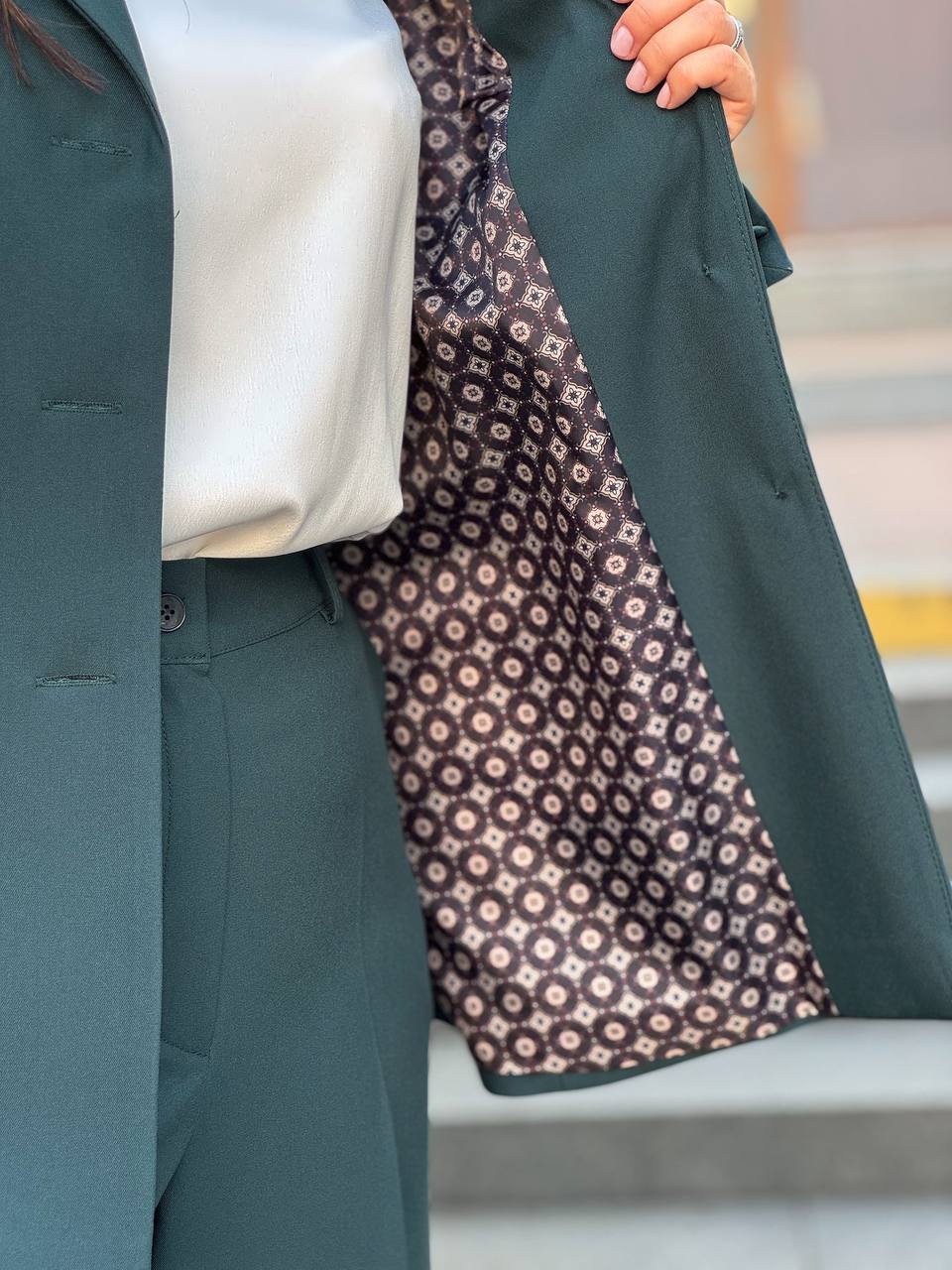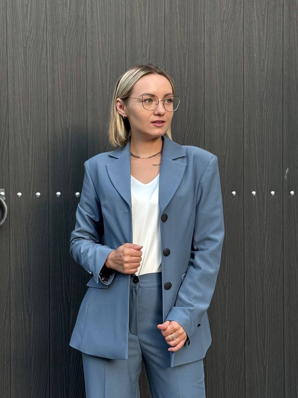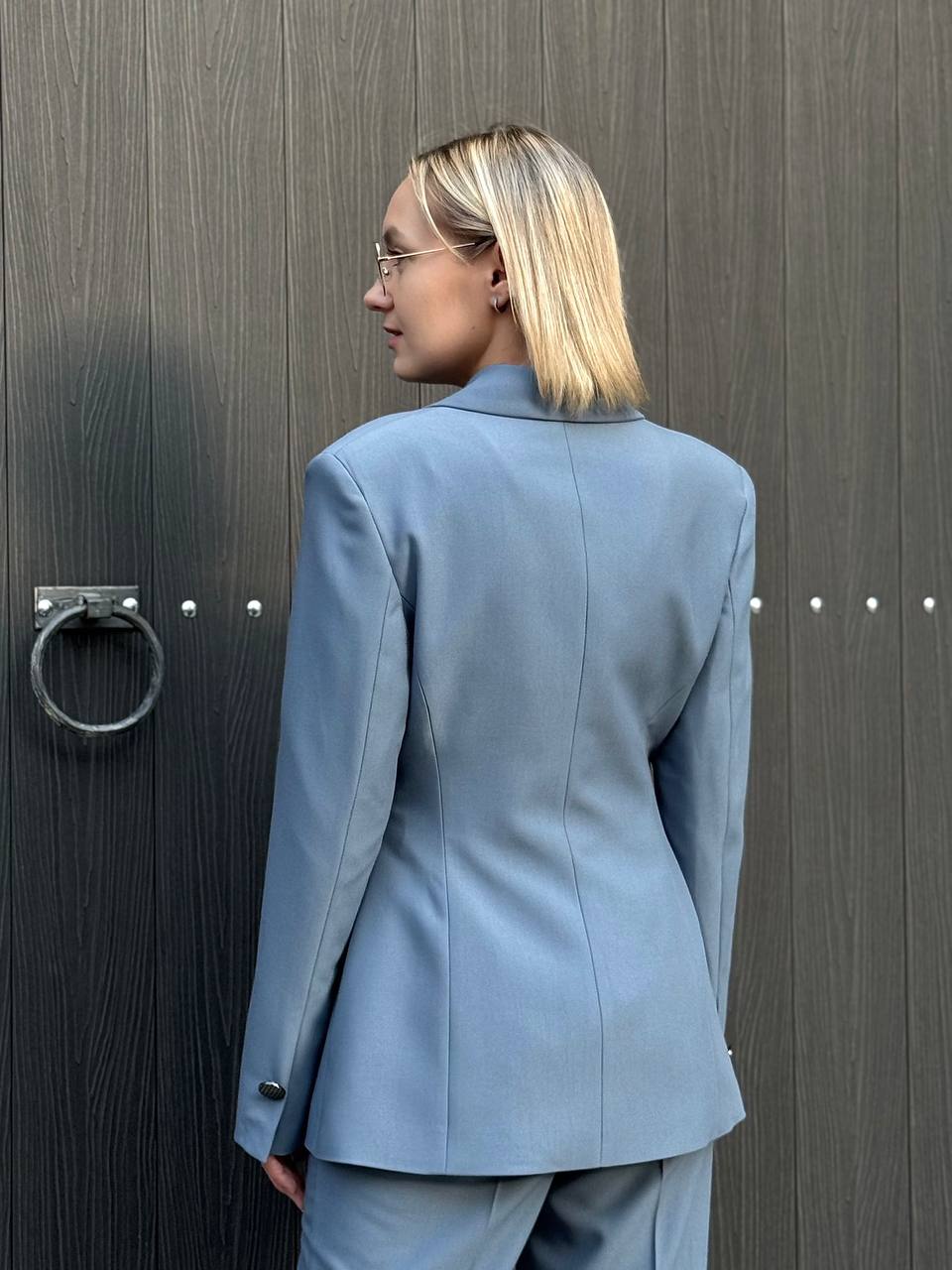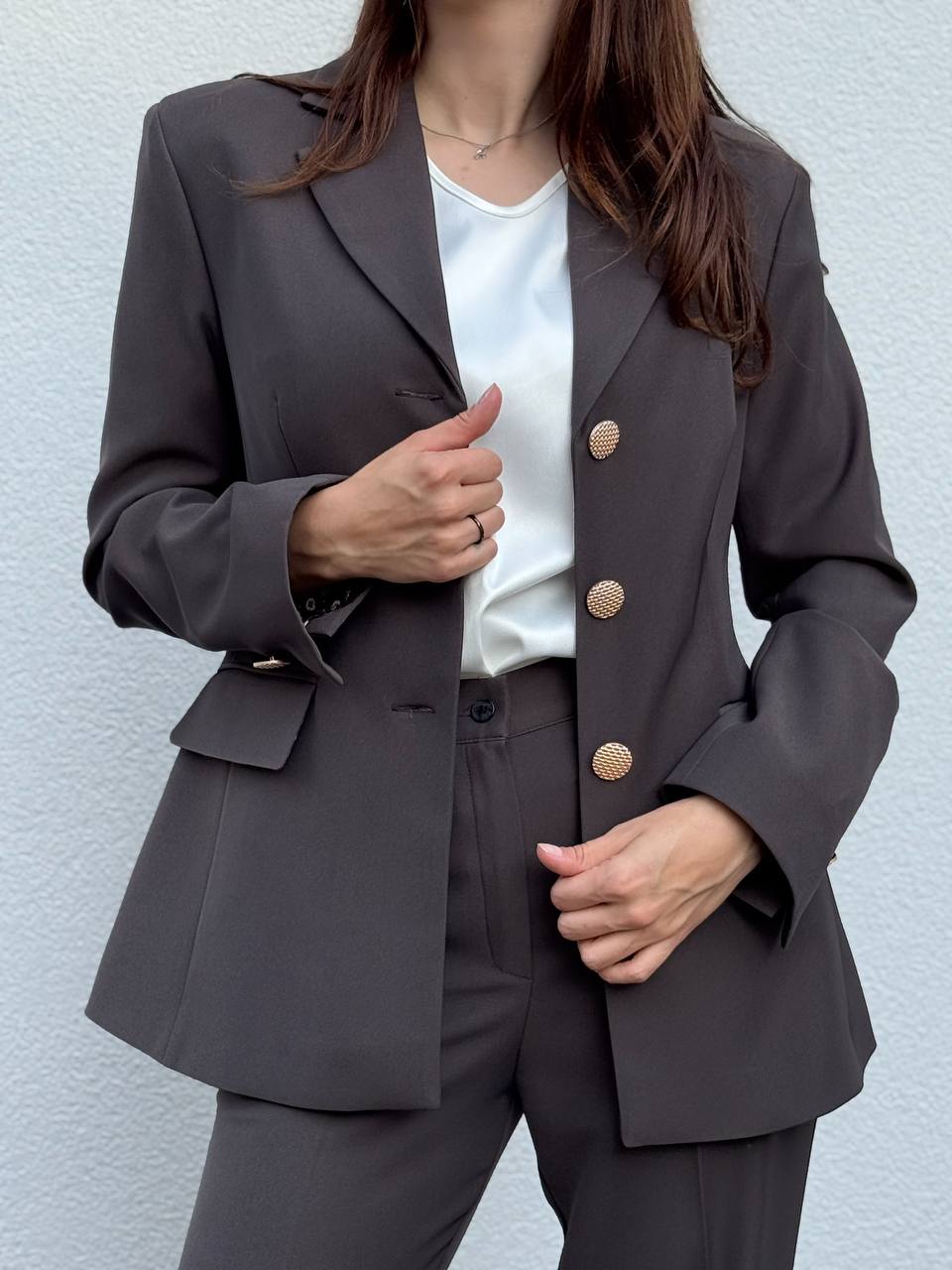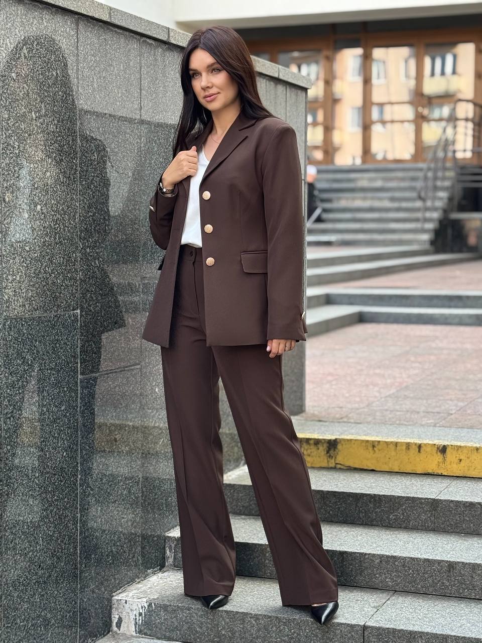 Элегантная модель пиджака приталенного силуэта с акцентом на плечи и мягким расклешением книзу, что придает силуэту структуру и утонченность.