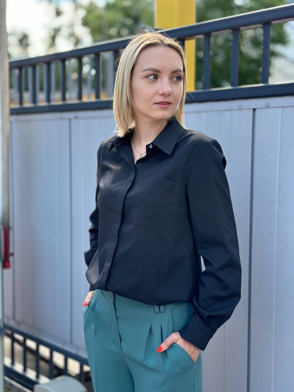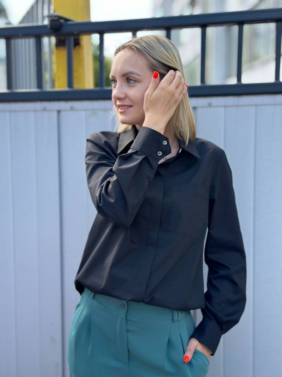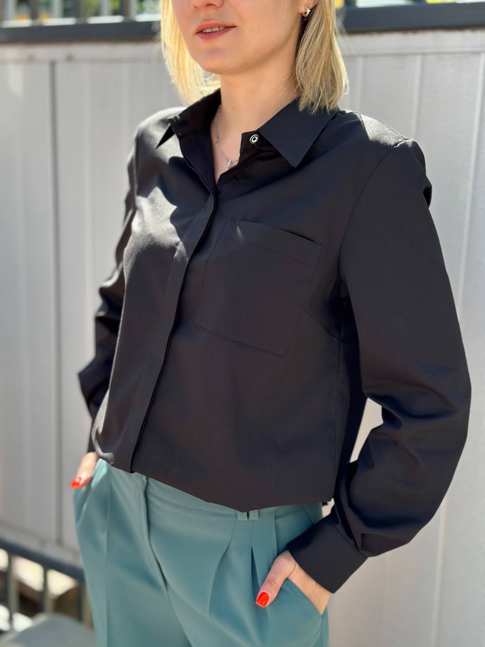 Базовая  хлопковая рубашка прямого кроя в черном цвете с акцентным карманов на груди. Незаменимая часть гардероба, которая позволяет создать множество стильных образов.