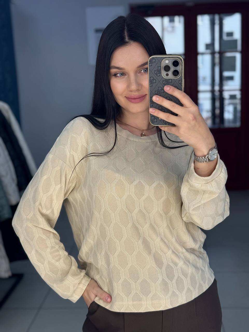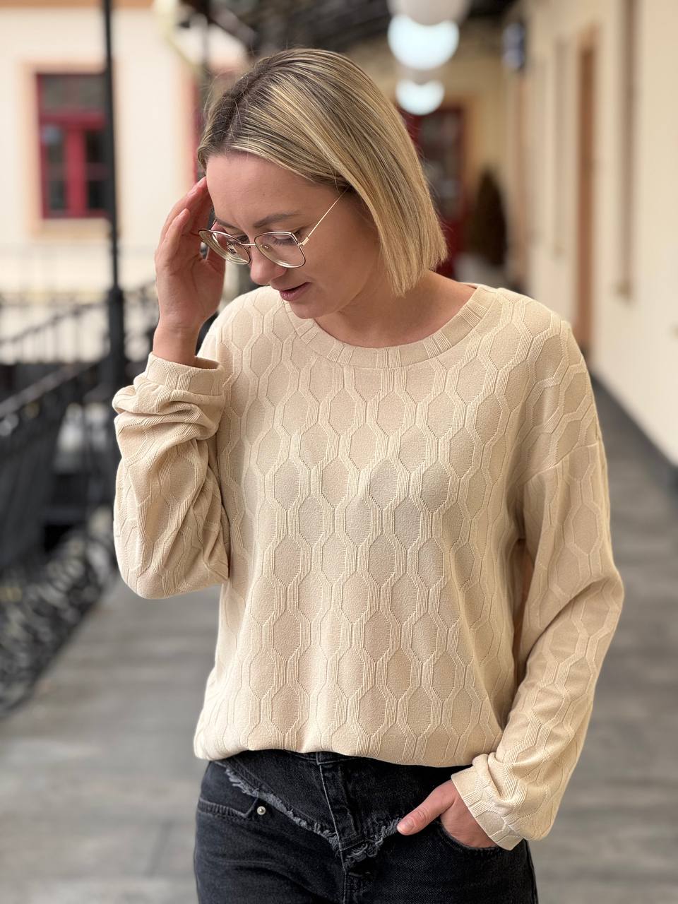 Джемпер прямого силуэта в нежном оттенке "крем-брюле", который выполнен из приятного на ощупь трикотажа.