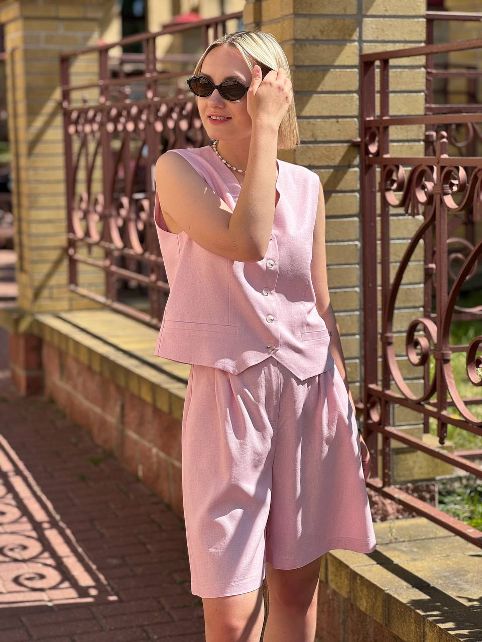Стильный льняной костюм, состоящий из жилета и удлиненных шорт.