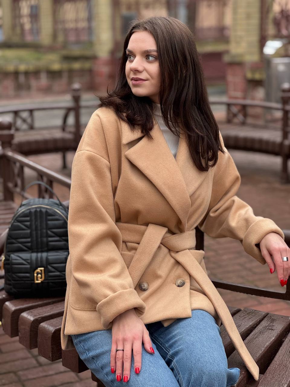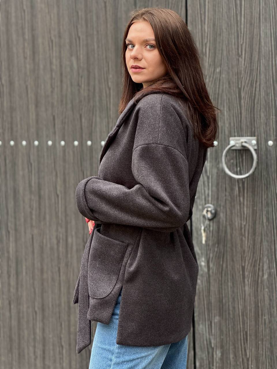 Двубортное полупальто свободного силуэта со спущенными плечами и поясом.