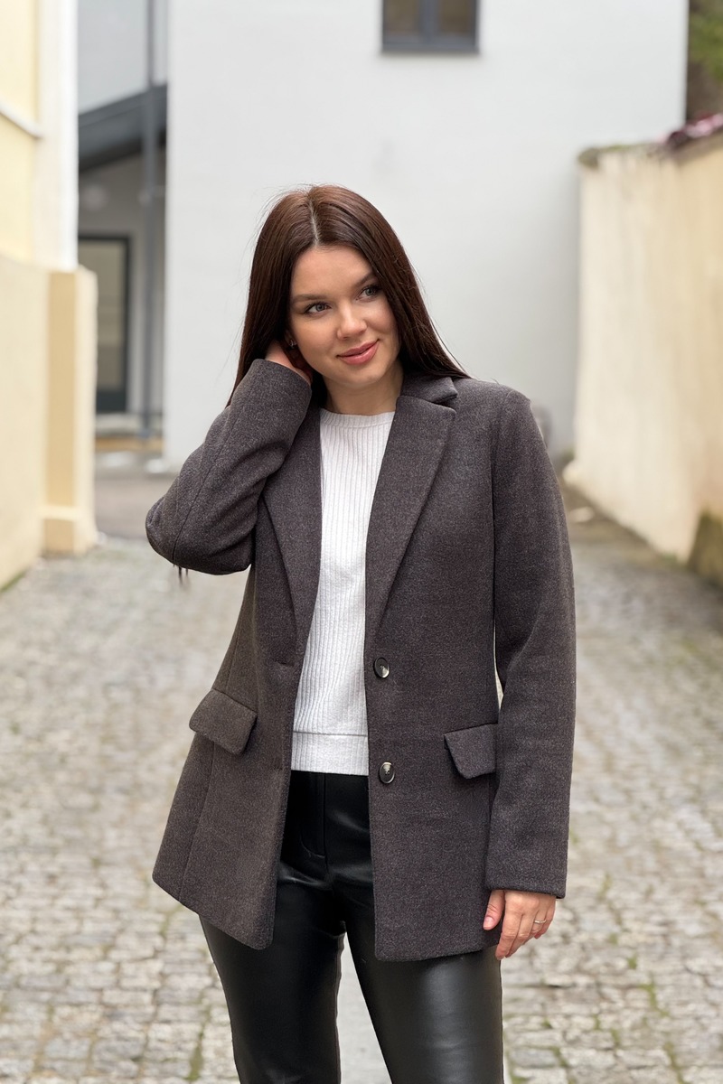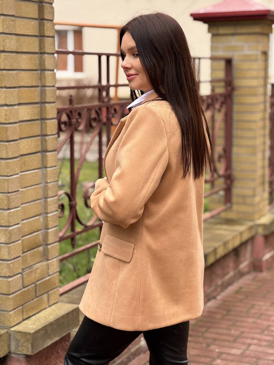 Пальто-пиджак  из мягкой плотной ткани прямого кроя.