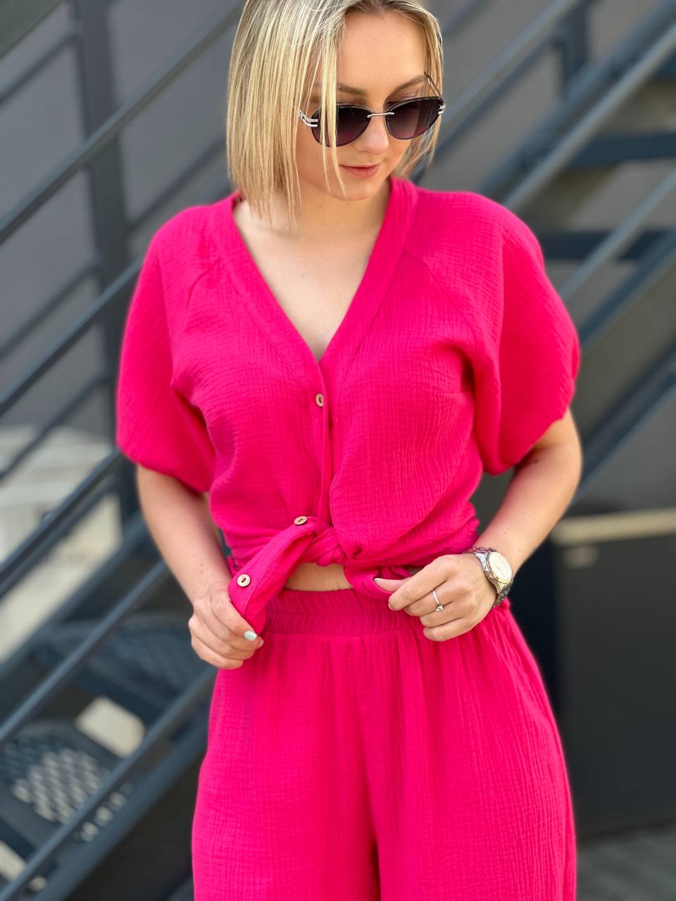 Легкий брючный костюм из муслина, который состоит из невесомой женственной блузы и широких брюк из нежнейшего хлопка.