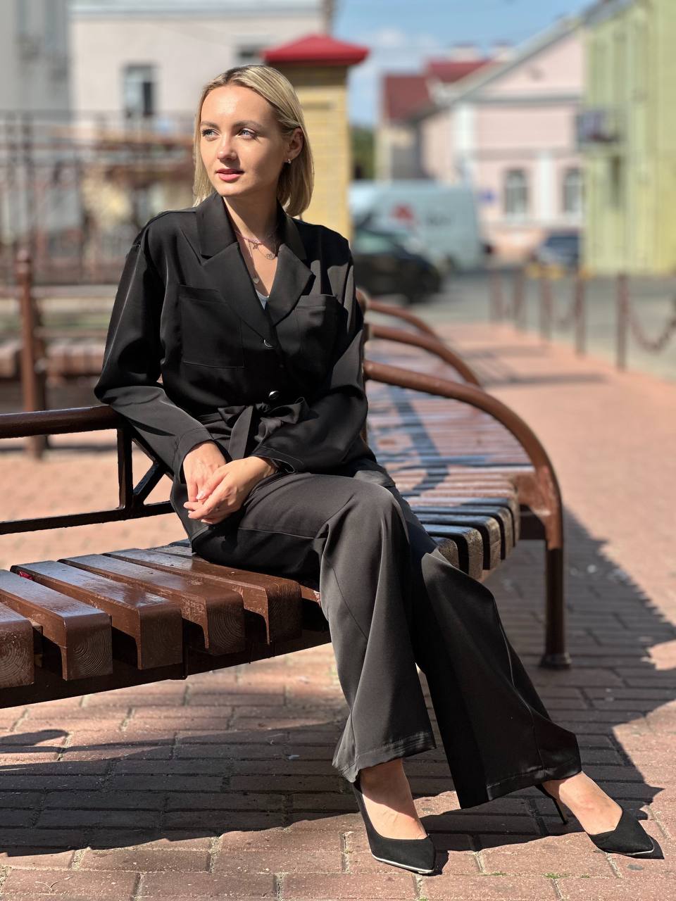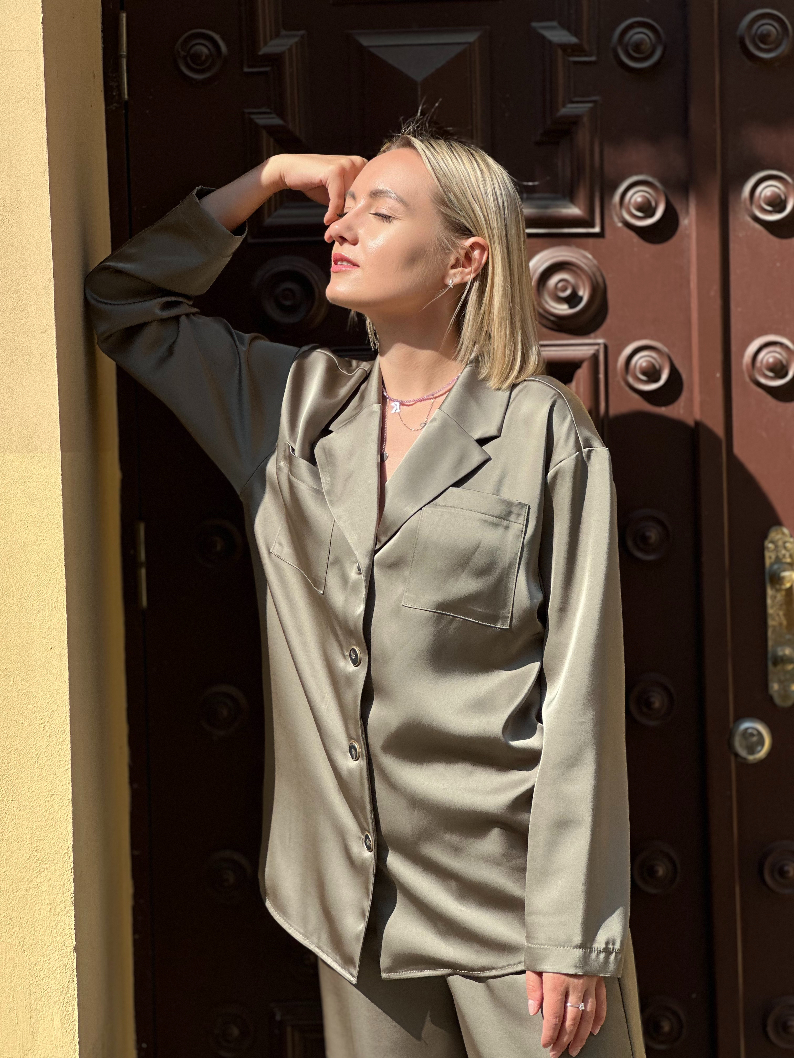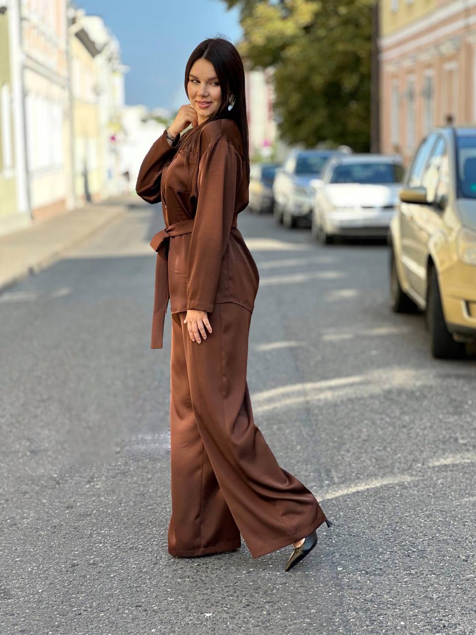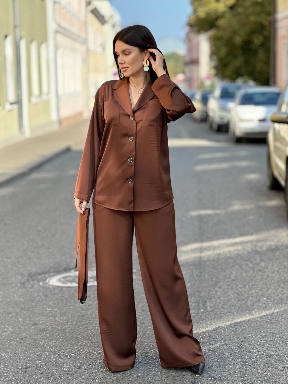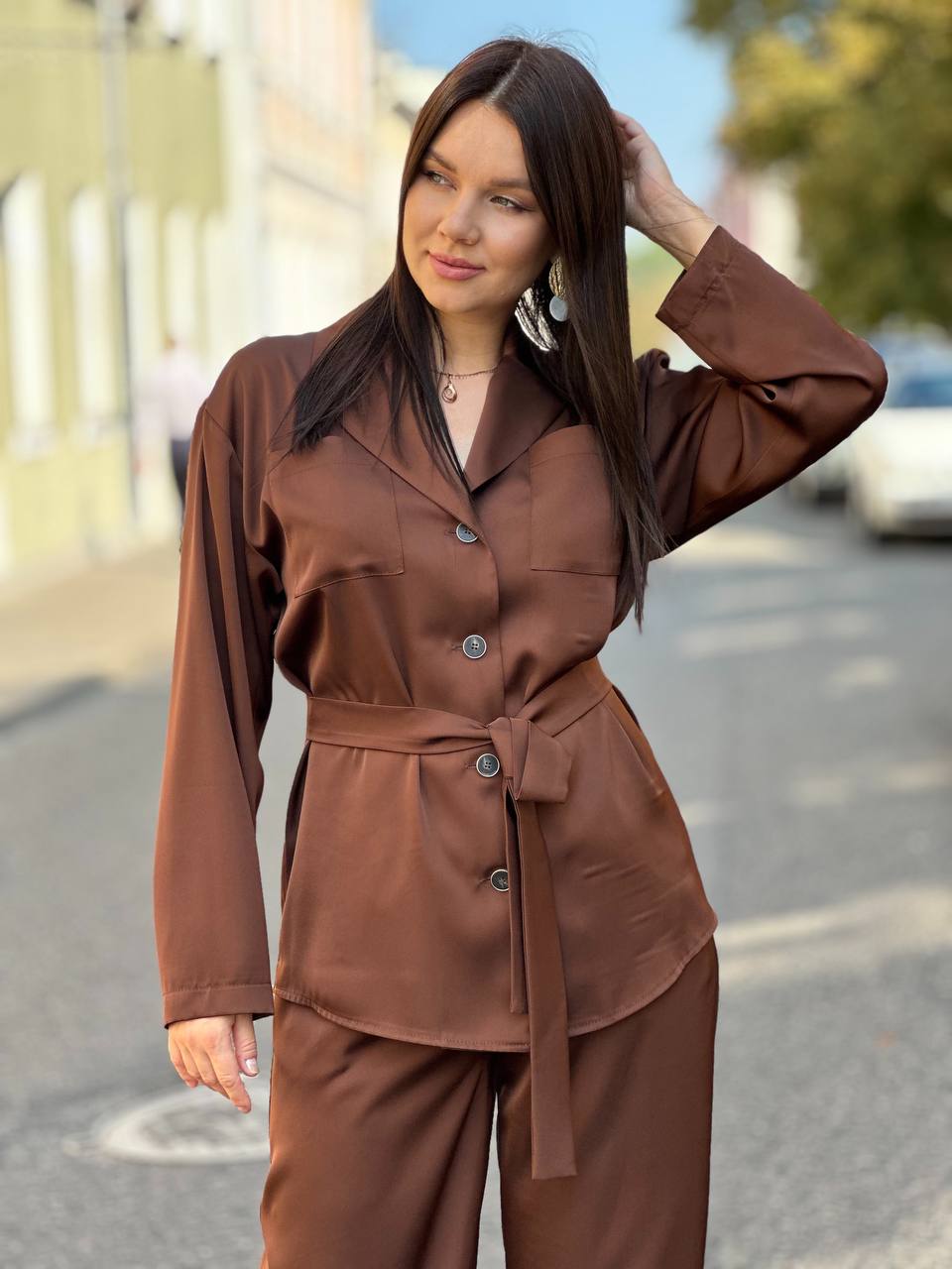 Эффектный костюм пижамного кроя из премиальной шелковой ткани. Он состоит из брюк свободного силуэта с резинкой на талии и жакета рубашечного кроя со спущенными плечами. Пояс в комплекте.