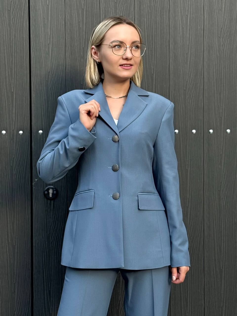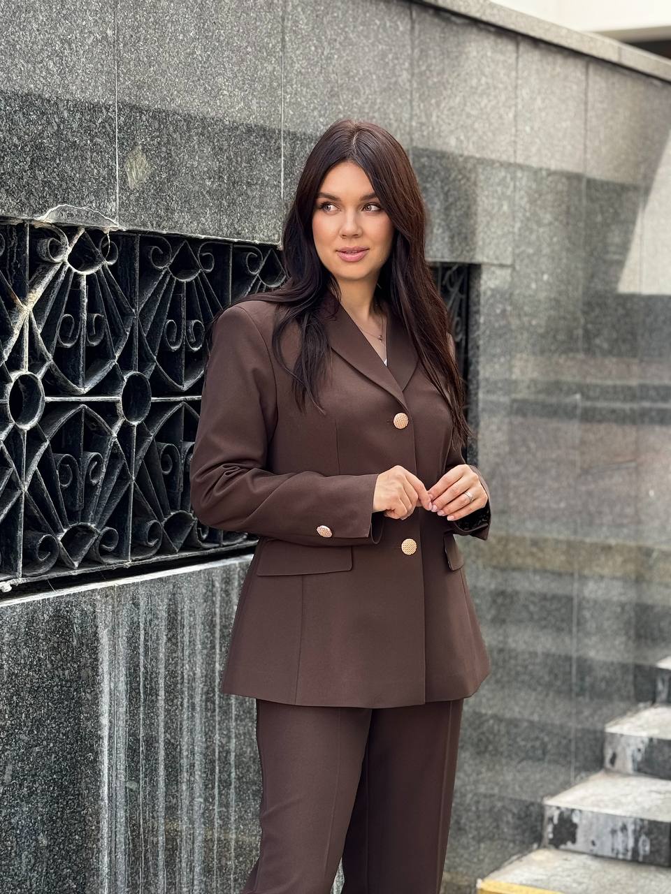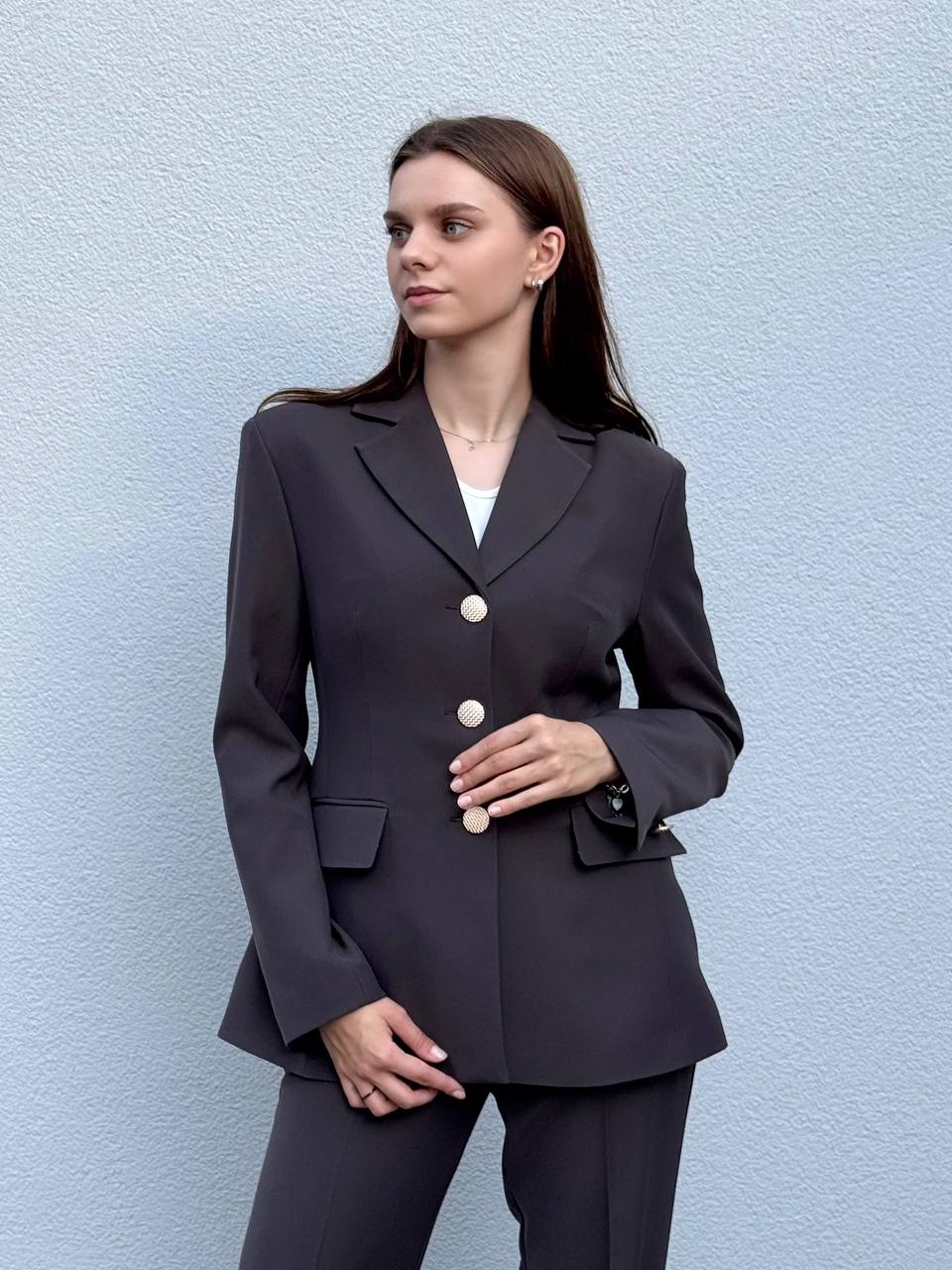 Элегантная модель пиджака приталенного силуэта с акцентом на плечи и мягким расклешением книзу, что придает силуэту структуру и утонченность.